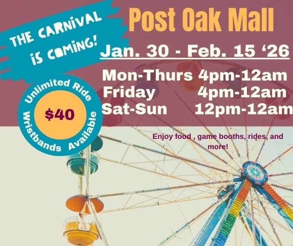 The Wright Amusements Carnival is rolling into Post Oak Mall, January 30–February 15, and it’s bringing all the excitement—rides, games, food, and fun for the whole family!